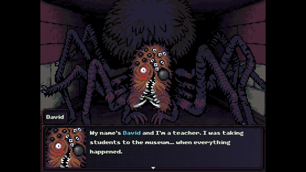 All the characters in the game fall into three categories: humans who did not look outside and thus retained their sanity; humans who looked outside and mutated, losing their mind, and finally humans who looked outside, mutated but DIDN'T lose their mind or at least not completely (that's my favorite category). The wondrous thing about Look Outside is that it is a party-based RPG, and the party assembly process is just WILD. There are so many characters you can recruit, and many of them I did not even meet in my playthrough. One of the potential party members apparently knocked at my door but I didn't open; the next time he showed up I did open the door but he tried to eat me because by that time he had looked outside and turned into a giant centipede so I had to fight for my life. Maybe, the same happened to many other characters: I just refused to meet them, or the circumstances never brought us together, and thus they were never in my party. I know it might seem annoying, but I am honestly delighted. This speaks not only to the replayability of the game, but also to the crazy variety of party member combos you can get. The people I DID have in my party joined me under the most insane circumstances that just could NOT happen. My first party member tried to eat me, and I thought she was a boss. The game hadn't yet explained to me how to run away from a fight, so I clenched my fists and just brawled her. Turned out, she was a recruitable character, and we've been besties ever since! Nothing better to spice up your life than a party member who can eat you at any time if she so chooses. Another lady just knocked on my door late at night. Usually, the 'knock at the door' events happen in the evening when you come back from a long day, and they can resolve in a number of ways: you can just ignore the knock and not open the door, or you can ask the person on the other side who they are, and then decide if you want to open. It might be a merchant, a potential party member, a bossfight or just a one-off event like a wounded dude who'd buy bandages or other healing supplies from you. Because I was usually exhausted from my long day and my stats were low, I was always very careful about the door knocks, at least before dinner. As soon as I saw her, I was like, well, this is CLEARLY a bossfight. No, it's just the strongest damage dealer in my party who just showed up at my doorstep like a present. I won't even try to tell you how I got my third party member, you won't believe me anyway. It was just a chain of insane events that I hoped with all my heart would result in that character being recruitable at some point. Oh, and I also permanently lost my arm in the process. But that's okay.